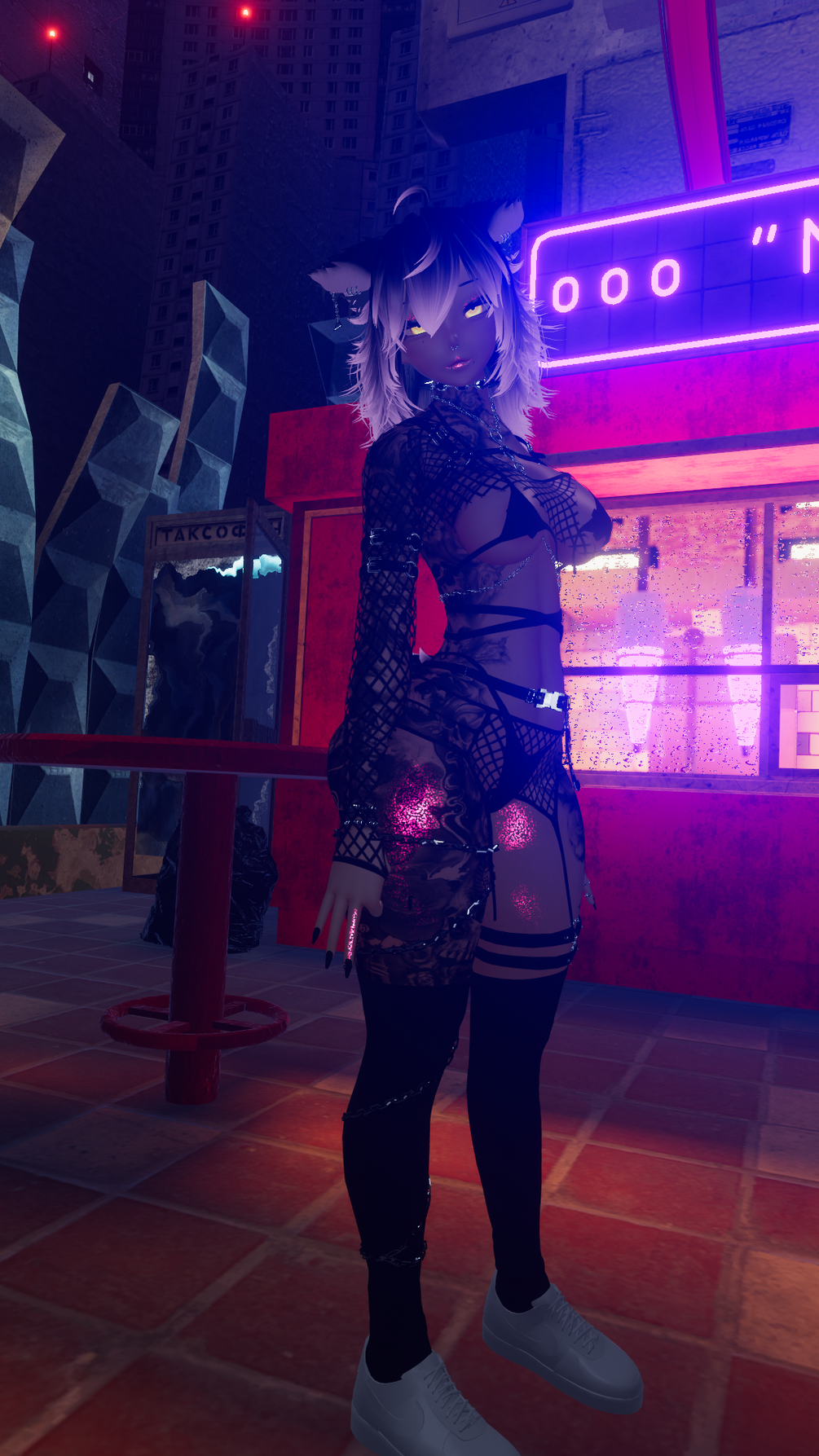 arm chain, arm strap, backhair1-2, bangs1-2, bra, bracelet, bunny, chain harness, choker, croptop, ears, tail, fishnet top, harness, heels, jeans, jean shorts, leg chain, leg strap, lowerwaist garter, mesh top, off-shoulder top, pasties, rings, skirt, socks, thighhighs, panties.